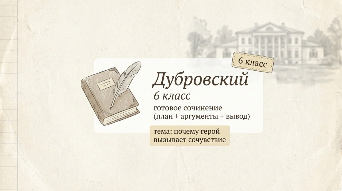 Пример вступления (готовый абзац) Роман А. С. Пушкина «Дубровский» рассказывает о том, как из-за несправедливости и жестокости один человек теряет привычную жизнь. Владимир Дубровский показан не как “плохой разбойник”, а как молодой дворянин, которого обстоятельства довели до отчаяния. Я считаю, что Дубровский вызывает сочувствие, потому что он страдает не по своей вине, переживает тяжёлую утрату и при этом старается сохранить честь и человечность.