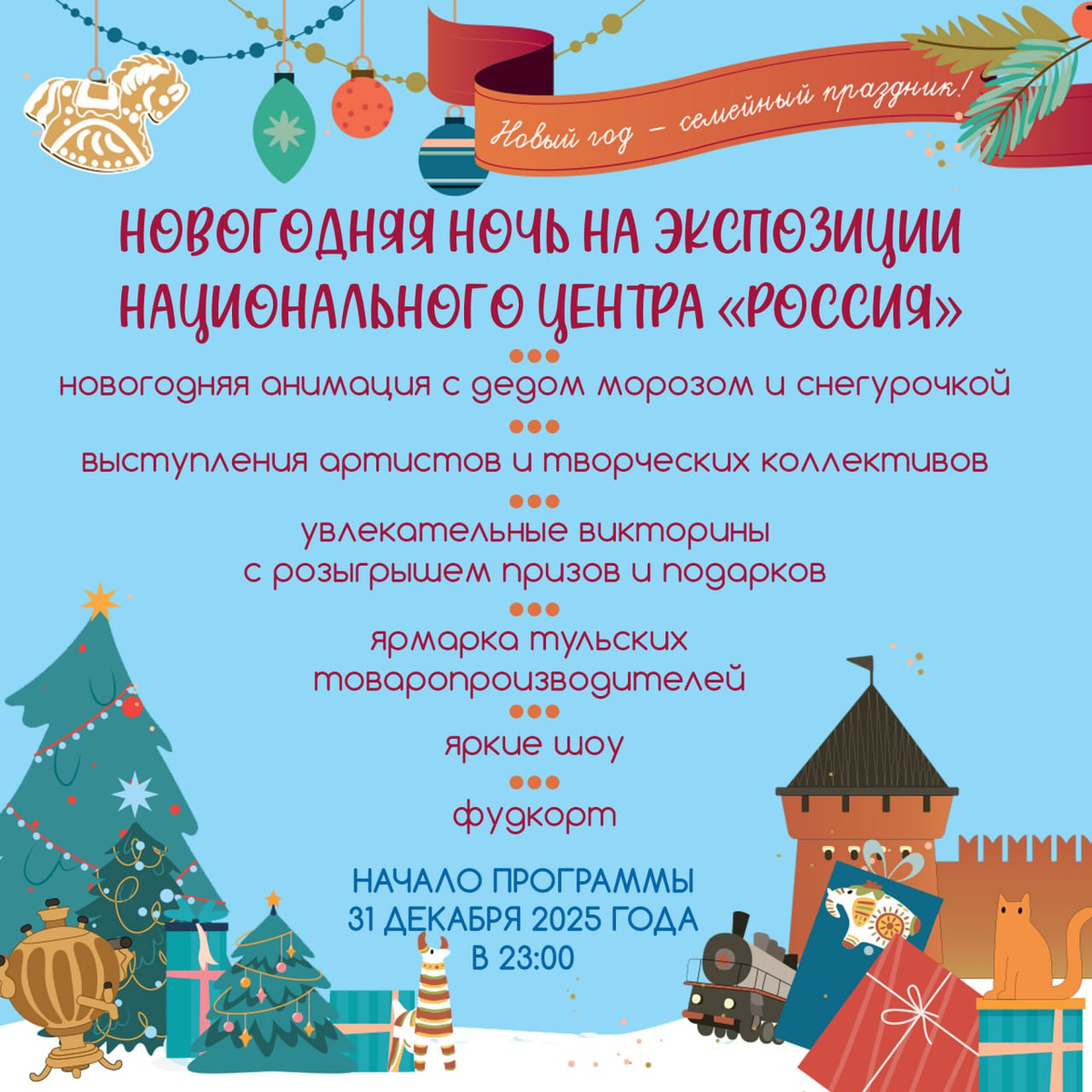 Встретить наступление 2026 года в праздничной атмосфере смогут жители и гости Тулы. Местом проведения традиционных народных гуляний станет стенд национального центра «Россия» по адресу: ул. Советская, 1/1. Программа праздника стартует 31 декабря в 23:00. Центральным украшением площадки станет шестиметровая новогодняя ель. Гостей будут встречать Дед Мороз и Снегурочка, а также ждут выступления творческих коллективов, музыкальные номера и развлекательные викторины с призами. На празднике развернётся ярмарка с продукцией местных производителей, где можно будет приобрести оригинальные подарки и сувениры. Для желающих подкрепиться будет работать фуд-корт с разнообразными угощениями. По информации пресс-службы министерства массовых коммуникаций Тульской области