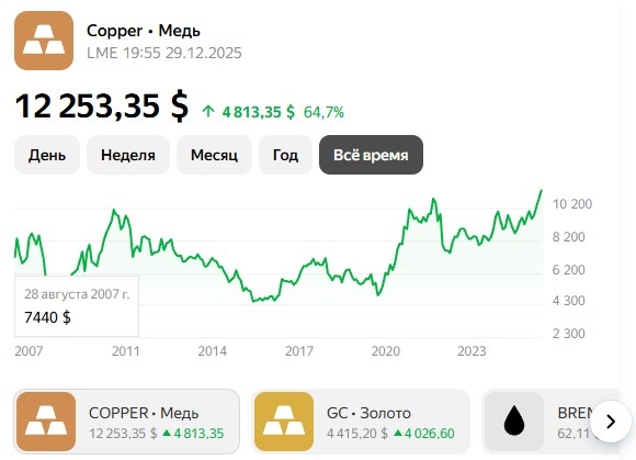 За прошедший год рынок меди продемонстрировал беспрецедентный рост цен, достигнув исторически высоких уровней как на американском рынке Commodity Exchange (Comex), так и на Лондонской бирже металлов (London Metal Exchange, LME). По данным исследования аналитической группы LSEG, средняя стоимость металла превысила отметку в 12 253,35 $ долларов за тонну на 29 декабря 2025 года, установив новые рекорды, значительно превышающие максимальные значения предыдущих лет.