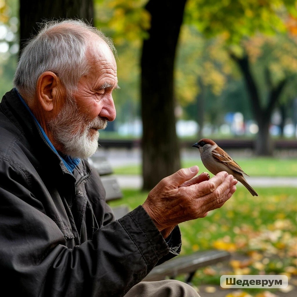 Старик сидел на лавочке, словно вросший в нее, как старое дерево в землю. Его спина была согнута, плечи опущены, но взгляд, устремленный вдаль, казался удивительно живым, полным невысказанных историй. У его ног, потертая и видавшая виды, лежала сумка – верный спутник, хранящий, наверное, не меньше тайн, чем сам старик.