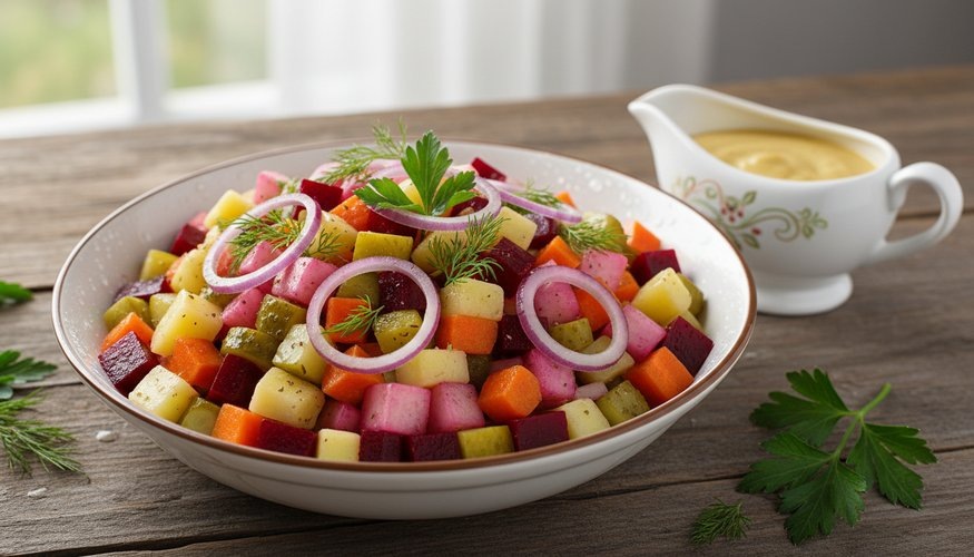 Здравствуйте, мои хозяюшки! Зима — время корнеплодов. И король зимнего стола, конечно же, Винегрет. Полезный, недорогой, витаминный. Казалось бы, ну что тут нового придумать? Свекла, картошка, огурцы… Но вы замечали, что у кого-то винегрет съедается за минуту, а у кого-то стоит днями? Всё дело в заправке! Обычное масло — это скучно. Я добавляю в заправку два простых ингредиента, которые превращают простой салат в ресторанное блюдо. Вкус становится ярким, пикантным, кисло-сладким. Муж теперь просит готовить винегрет только так! Основа (как обычно): Маленький совет: Чтобы свекла не окрасила весь салат в один цвет, нарежьте её первой и полейте маслом отдельно. Только потом смешивайте с остальными овощами. Та самая “Секретная заправка”: Забудьте про просто “полить маслом”. Сделаем соус!