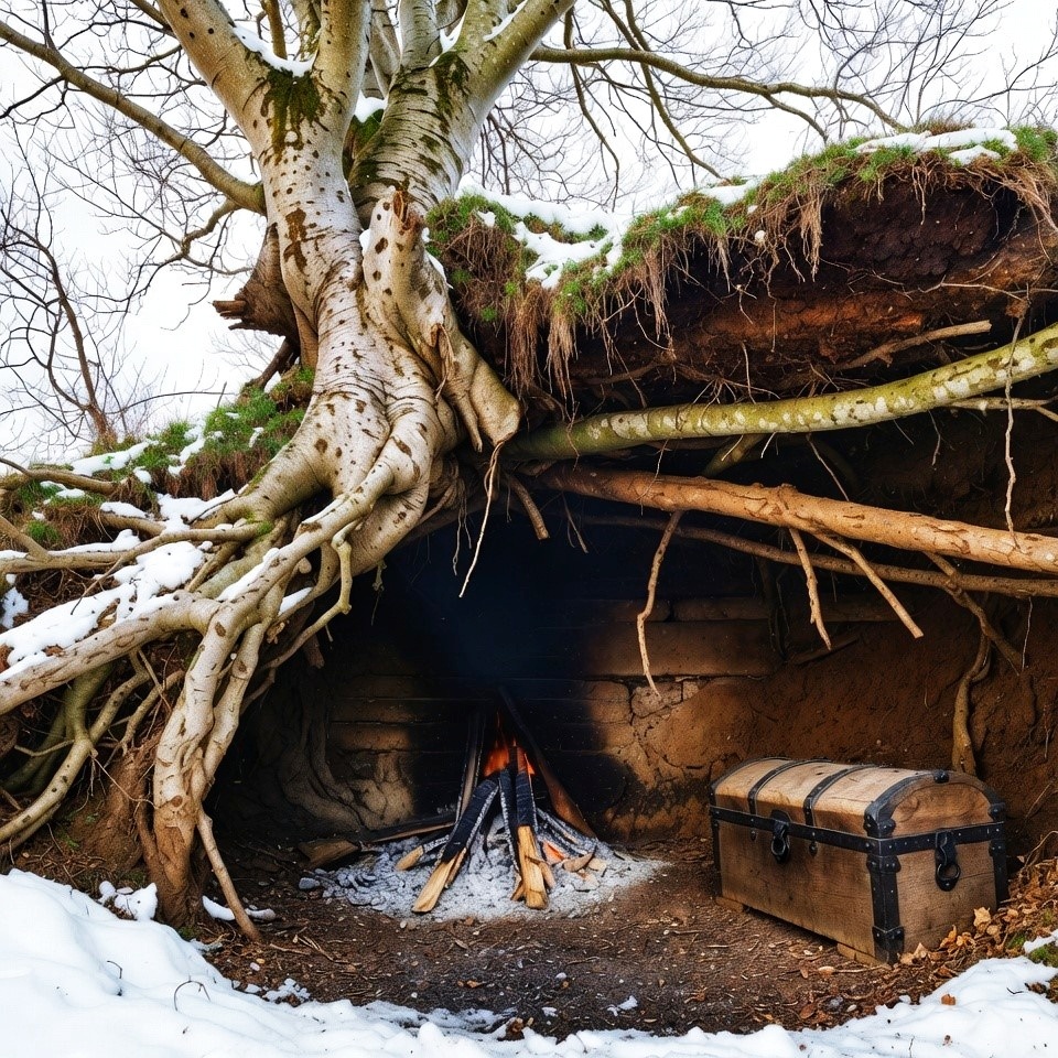 Бук вырвало бурей, он увлёк за собой дёрн. Лаулесс устроил здесь тайное убежище. Корни служили стропилами, дёрн — крышей, а земля — стенами и полом. Несмотря на дикость жилища, закопчённый очаг и обитый железом дубовый ящик говорили о том, что здесь живёт человек, а не зверь.