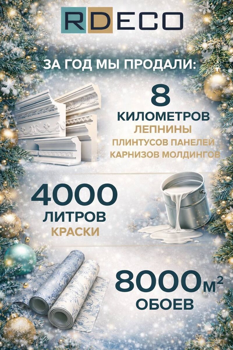 🤩🤩🤩🤩🤩 🤩🤩🤩🤩🤩 За этот год мы сделали очень многое — в интерьерах, деталях и пространствах, где хочется жить. 🔹 8 километров лепнины — плинтусы, панели, карнизы, молдинги 🔹 4000 литров краски — оттенки, которые создают настроение 🔹 8000 м² обоев — фактуры, ритмы и характер интерьеров За этими цифрами — сотни реализованных идей, десятки проектов и огромное внимание к деталям. Спасибо, что выбираете РДеко. Мы ценим ваше доверие и продолжаем создавать пространства с вашим характером. С любовью, ваш РДеко 🤩