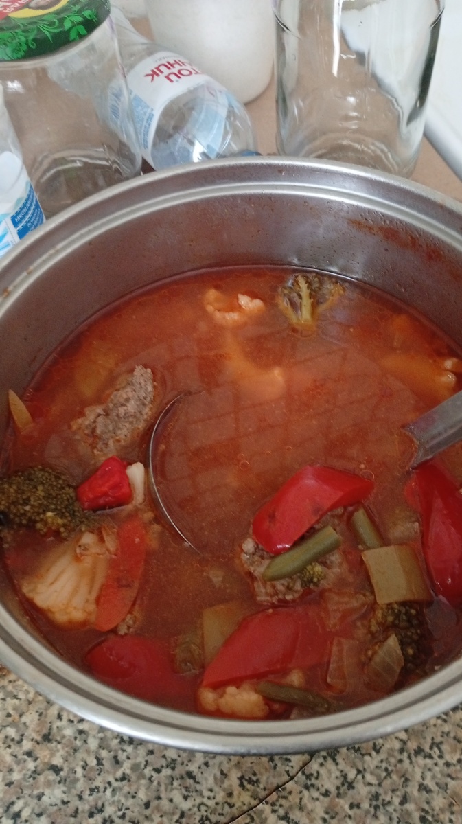 Сварила сегодня суп : лечо, капуста цветная и брокколи, фрикадельки из остатков фарша , стучковая фасоль.