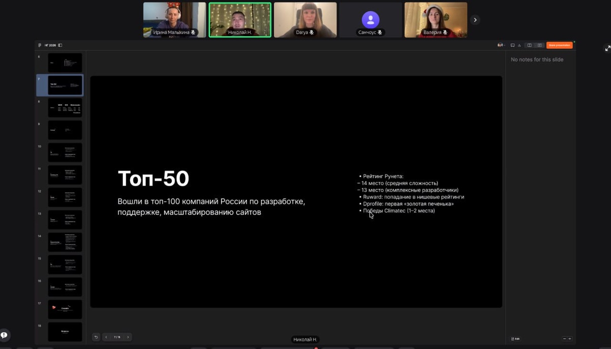 Что ж, доползли до последнего рабочего дня. За год произошло много всякого: хорошего и не очень. Не все планы удалось реализовать, но поводов быть довольными хватает. ✔️ За этот год мы заложили базу на следующий. Заключили важные контракты, поэтому теперь есть работа сразу на несколько кварталов вперед. ✔️ Вошли в топ-40 разработчиков веб-сайтов. А еще заняли 14 место в сайтах средней сложности и 13 место — в комплексной разработке. И это не просто строчки в рейтингах: клиенты реально начали приходить оттуда. ✔️ К нам пришли три крупных клиента с классными и долгими проектами — именно такие, с которыми хочется работать. ✔️ Заметно повысили узнаваемость. Весь год проводили эфиры, делали спецпроекты, посещали мероприятия, под конец года залетели в Качалку, познакомились с кучей классных ребят из агентств. Заказчики узнают нас по уже сделанным проектам, причем не только в Крыму. Это приятно. ✔️ Сильно прокачали процессы и навыки в аналитике, QA, дизайне и PM. Весь год брали все более