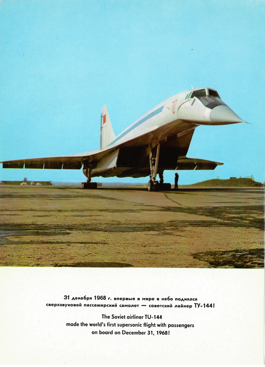 Ту-144 – советский сверхзвуковой пассажирский самолет, первый и один из двух в мире тип сверхзвукового авиалайнера, который использовался в гражданской авиации для коммерческих перевозок. 31 декабря 1968 года опытный Ту-144 впервые поднялся в воздух. Это произошло на два месяца раньше полета англо-французского сверхзвукового пассажирского самолета "Конкорд". В первый пассажирский рейс Ту-144 по трассе Москва – Алма-Ата отправился 1 ноября 1977 года. Полеты на расстояние 3260 км на высоте 16000-17000 м со скоростью 2000 км/ч проводились один раз в неделю, количество пассажиров на борту не превышало 80 человек. До момента прекращения регулярной эксплуатации с пассажирами в мае 1978 года, экипажи Аэрофлота на Ту-144 выполнили 55 рейсов, перевезя 3284 пассажира.