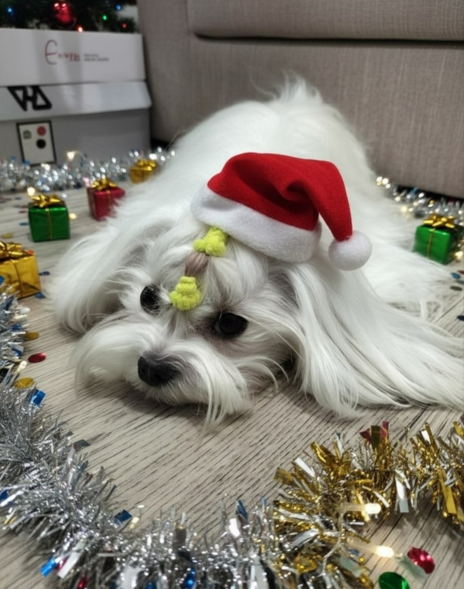 На мне эта смешная шапка, но, честно говоря, я не совсем понимаю, зачем она мне. Наверное, люди думают, что так я выгляжу особенно празднично. Но знаешь что? Мне и без шапки хорошо. Главное — чтобы было тепло и уютно.