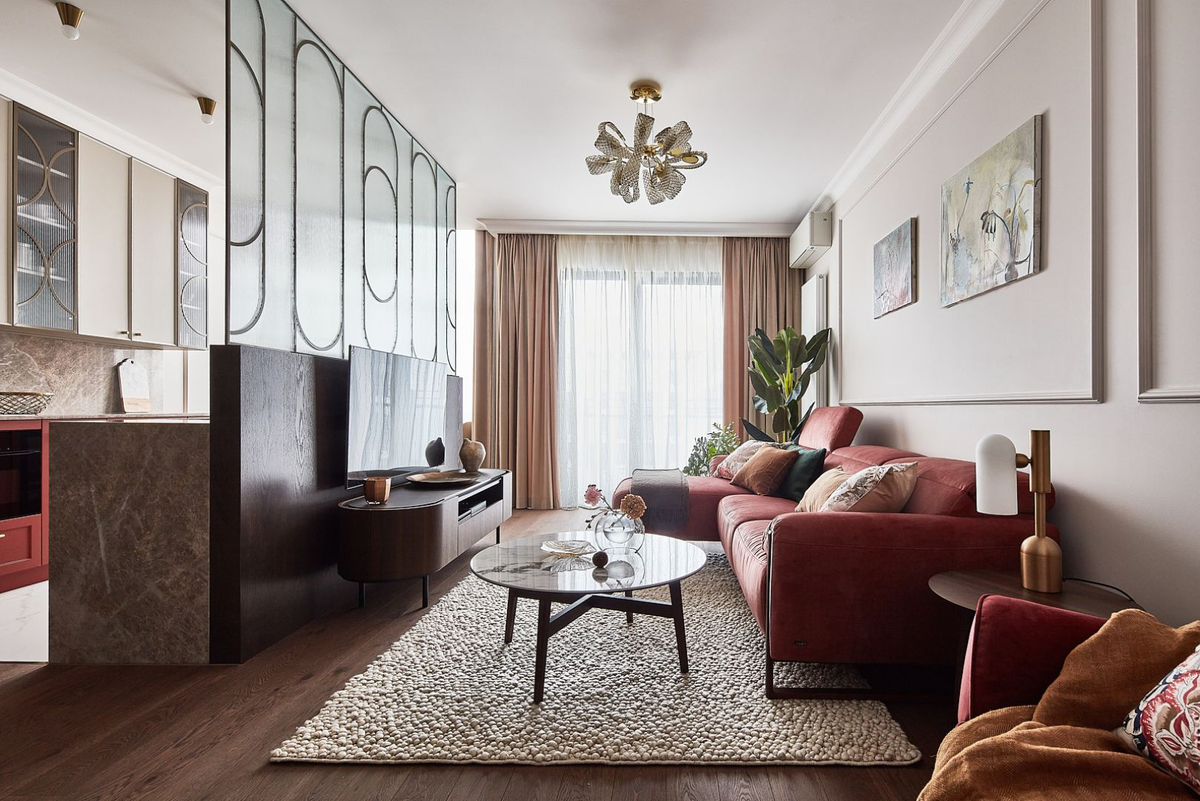 Стена в гостиной — это гораздо больше, чем просто фон для мебели. Она способна задать настроение интерьеру и сформировать его характер. Посмотри, что можно сделать со стеной за телевизором или за диваном — от дерева до декоративной штукатурки. Вот 10 идей, на которые стоит обратить внимание. В этой элегантной гостиной светлая палитра красиво контрастирует с темным деревом. Стена с телевизором оформлена встроенным модулем: верхняя часть — открытый стеллаж, легкий и воздушный, а нижняя — закрытая система хранения. Стена рядом украшена бежевой штукатуркой, добавляющей пространству классический акцент. Современная гостиная в доме, объединенная с кухней и столовой. За диваном установлены черные металлические полки — практичные и стильные. Декоративный акцент — бетонная стена напротив, выполненная из архитектурных панелей. Ее холодный, индустриальный характер смягчают деревянные шкафы и теплая отделка пола. Гостиная совмещена с библиотекой: одну стену занимает стеллаж с раздвижными стеклянн