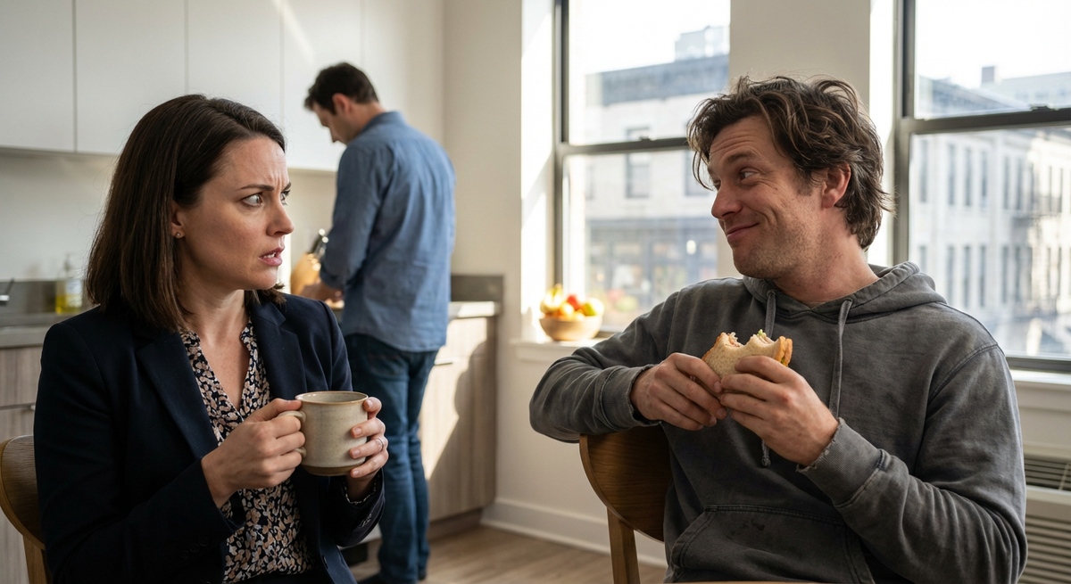 Ольга замерла с чашкой кофе в руке, медленно поворачиваясь к деверю. Геннадий, родной брат её мужа, сидел на их кухне так, словно был хозяином не только этого стула, но и всей квартиры в целом. Он вальяжно закинул ногу на ногу, откусывая большой кусок бутерброда с колбасой, и смотрел на Ольгу с той обезоруживающей простотой, которая, как известно, хуже воровства.