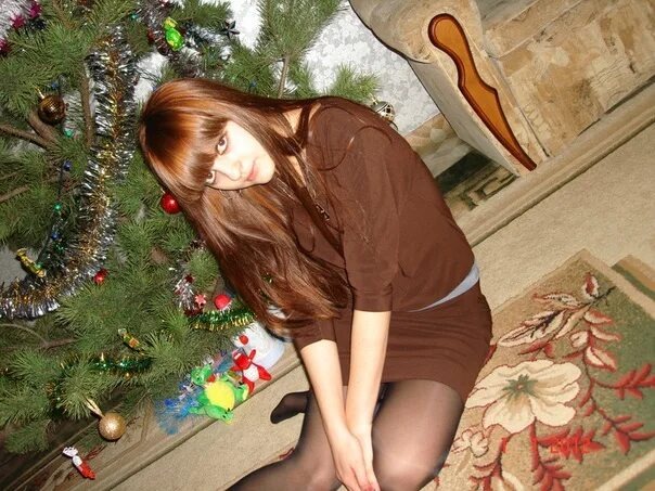 Девушка одета в простое, но элегантное коричневое платье, которое подчёркивает её стройную фигуру. Лёгкая небрежность позы придаёт образу естественности и непринуждённости: она слегка наклонилась вперёд, будто только что закончила украшать ёлку или собирается поднять одну из игрушек. Чёрные колготки гармонично дополняют наряд, создавая цельный и аккуратный образ.