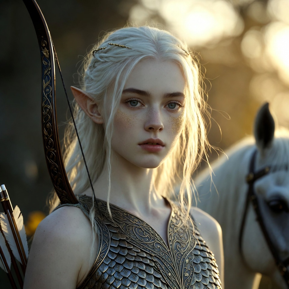 Она была прекрасна, как утренний свет над водой, и в то же время пугающа своей древностью. Волосы её сияли серебром и золотом, глаза были глубже, чем звёздное небо. Она опустилась на колени перед маленькой Аэлинэль, и та впервые в жизни почувствовала, что перед ней стоит не просто эльфийка, а нечто большее.
