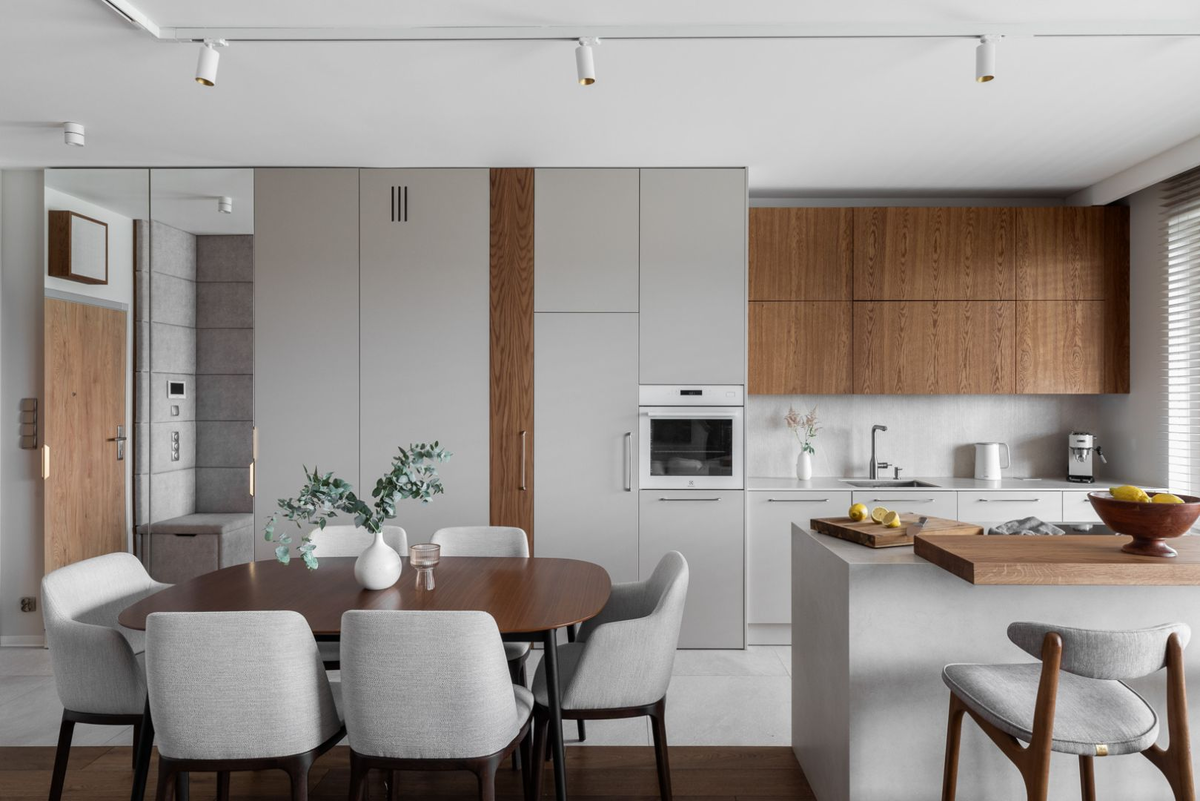 Если пока не знаешь, что выбрать, посмотри идеи дизайнеров. Мы собрали пять разных проектов. Каждая кухня оформлена в своем стиле: Эта кухня оформлена в современном стиле и продумана до мелочей. Основой стали серые оттенки — именно в этой гамме выполнена мебельная зона. Светлый тон серого прекрасно сочетается с теплым натуральным деревом, использованным на части фасадов. Стена над рабочей поверхностью и пол отделаны серой плиткой. Вместе они создают гармоничную, спокойную композицию. Кухню от гостиной отделяет остров и деревянный стол в комплекте с серыми мягкими стульями. Это кухня оформлена в эклектичном стиле. Здесь доминирует благородный голубой цвет — в него окрашены почти все шкафы и остров. Исключение составляют нижние шкафчики: их фасады отделаны дубовым шпоном, который добавляет тепла и уюта. Стену над столешницей украшает светлый спеченный кварц — этот же материал использован на рабочих поверхностях. Важным декоративным акцентом стали рельефные обои. Во всем интерьере много