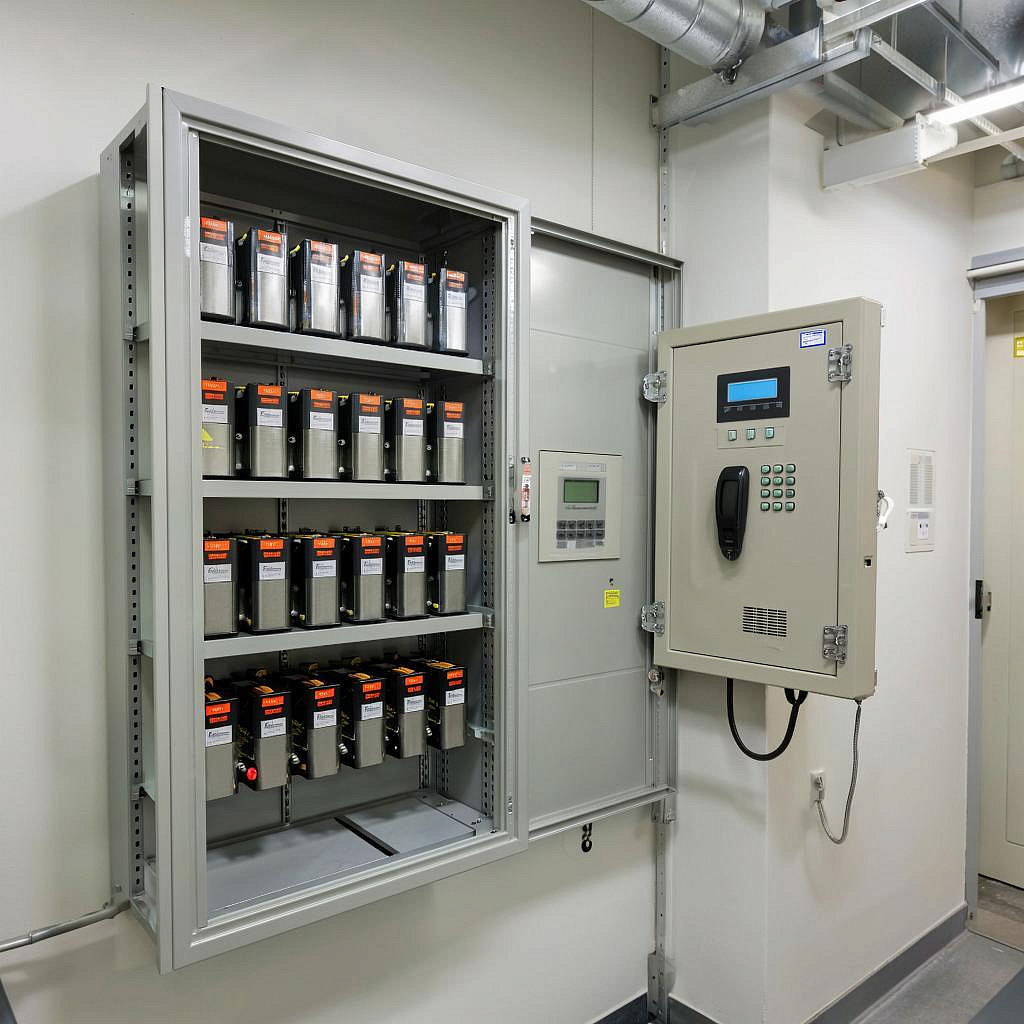 расстояние и износ кабеля, рекомендуется размещать аккумуляторы ближе к центральному участку системы – например, в корпусе шкафчиков операторов.