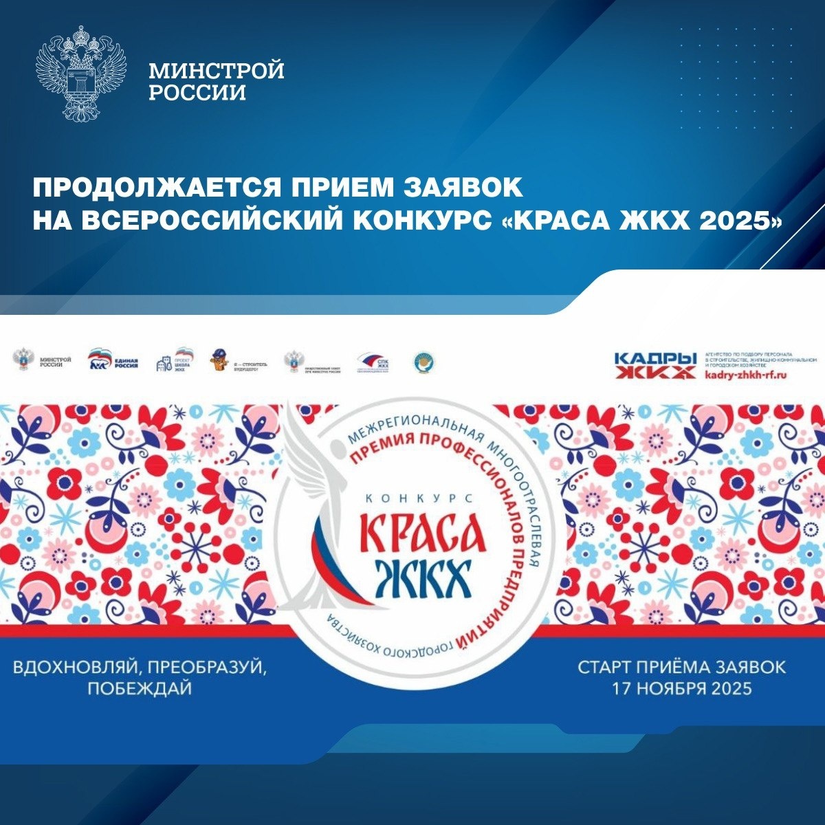 поддержке Минстроя России и партийного проекта «Единой России» «Школа ЖКХ». 📍Конкурс приурочен к пятилетнему юбилею Межрегиональной многоотраслевой Премии профессионалов городского хозяйства и посвящен роли женщины в жилищно-коммунальном комплексе. Миссия конкурса — повышение престижа и популяризация профессий ЖКХ, формирование привлекательного образа отрасли и укрепление корпоративной культуры. Соискательницы премии получат мощный стимул для профессионального роста, обменяются передовым опытом и практиками. 🔹Номинации конкурса охватывают все ключевые направления деятельности жилищно-коммунального хозяйства: жилищную сферу, обращение со вторичными продуктами, теплоснабжение электроснабжение, водоснабжение и водоотведение. Подать заявку можно до 27 февраля 2026 года. Подробнее на официальном сайте конкурса (https://krasa-zhkh-rf.ru/) 📲 Минстрой России в MAX