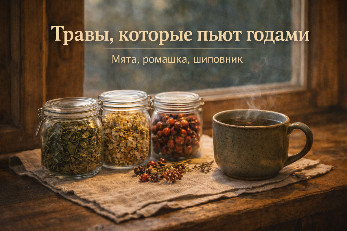 Это снова ваша Баба Люба. Раньше травы в доме держали не «на случай болезни». Они были как соль или хлеб — просто потому что нужны. На подоконнике стояли баночки, в шкафчике шуршали мешочки, и никто не говорил слов «курс» или «дозировка». Травы пили годами, понемногу, по настроению и по времени дня. Пили не для того, чтобы что-то срочно исправить, а чтобы жить ровно. Мята, ромашка, шиповник — эти травы не обещают чудес и не действуют резко. В этом и их сила. Они не вмешиваются, а сопровождают. Когда пьёшь их регулярно, организм не вздрагивает, а привыкает к спокойствию. Мята была в доме, потому что жизнь не всегда тихая. Она помогала выдохнуть, отпустить напряжение, успокоить желудок и мысли. Её заваривали вечером, после гостей, после дороги, после тяжёлого дня. Не чтобы «лечиться», а чтобы стало полегче. Ромашку уважали за мягкость. Её пили, когда внутри было неспокойно, когда еда не радовала,