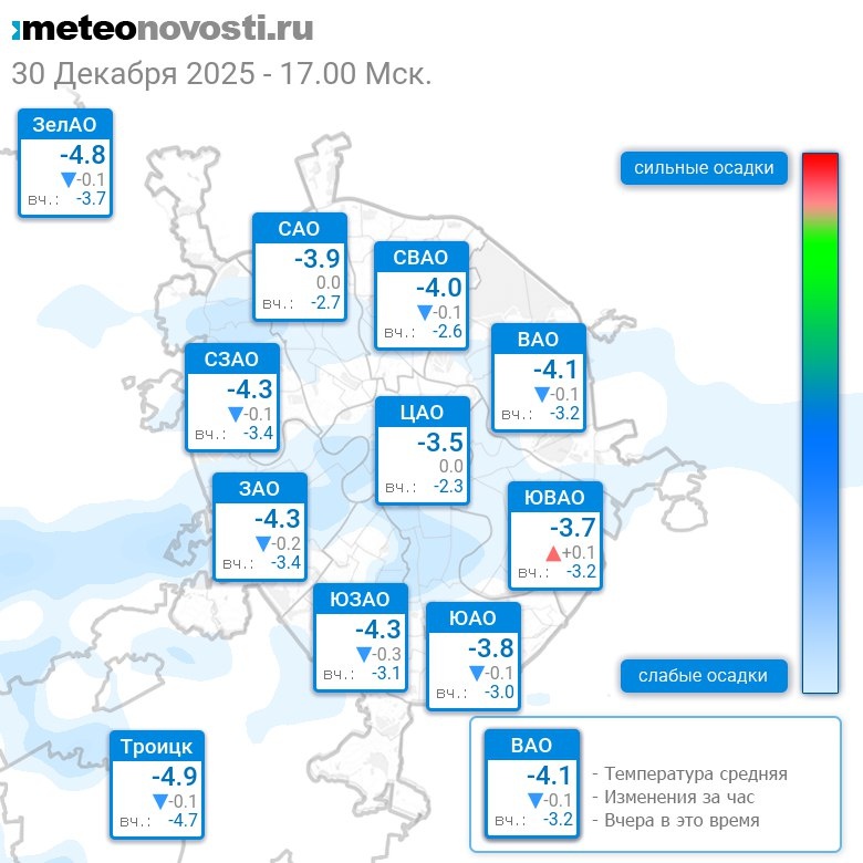 В 17:00 в Москве было от -5.1°C до -3°C, средняя температура -4°C #погода #Москва #зима #температура #30декабря #вторник