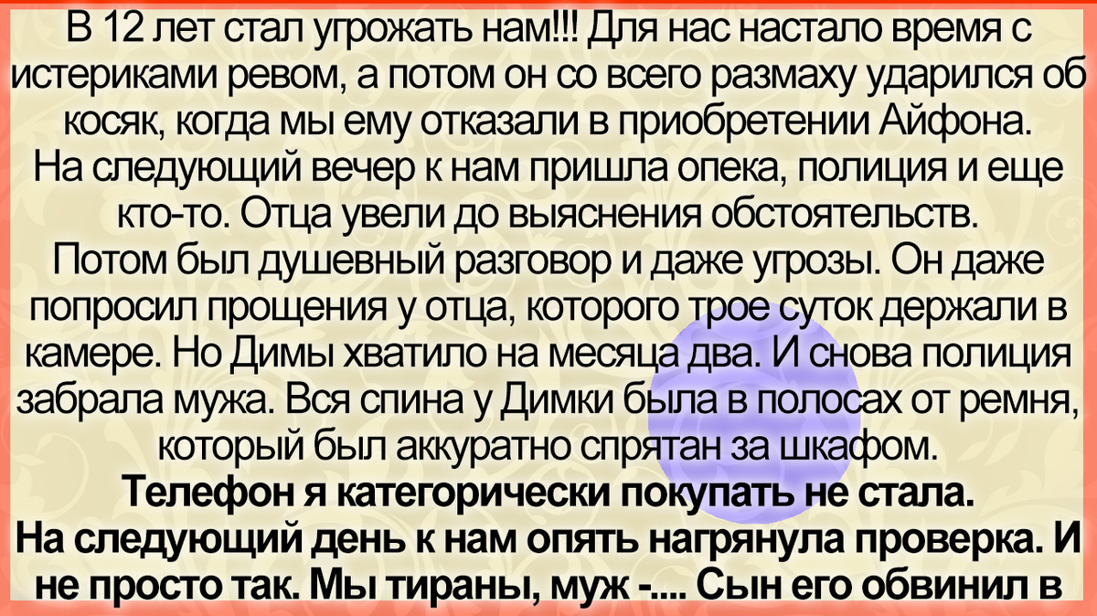 Слава Богу, что ему было 7 лет, и этим разговором все закончилось. Сейчас ему 13, теперь другие проблемы. Я еще сказала тогда: Хорошо, ты позвонишь, пожалуешься на маму, приедут тетеньки из опеки вместе с полицией, маме выпишут штраф, на что она тогда тебе будет все покупать, да еще и тебя заберут от мамы в приют, будешь жить без мамы, а там тебе точно никто ничего лишнего не купит.