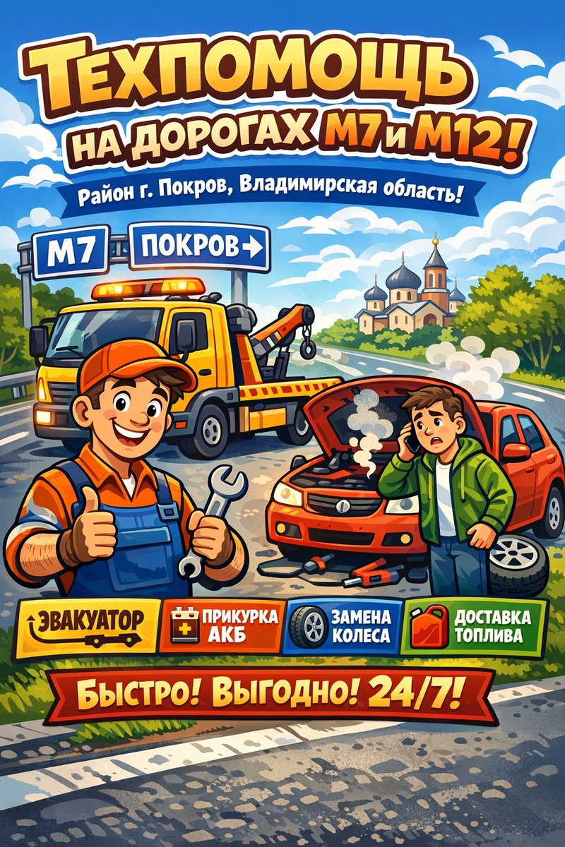 Техпомощь на трассах М7 и М12 в районе Покрова — это оперативная поддержка водителей, оказавшихся в сложной ситуации на дороге. Участок федеральных трасс вблизи города Покров (Владимирская область) отличается высокой загрузкой, интенсивным потоком транзитного и коммерческого транспорта, а также большими расстояниями между населенными пунктами. В таких условиях быстрая реакция и профессиональная помощь становятся важным фактором безопасности. Наши услуги включают: Специфика трасс М7 и М12 делает важным именно выездной формат сервиса. Дорожная инфраструктура на этих участках активно развивается, но водителю все еще сложно самостоятельно решить проблему при отсутствии инструментов, топлива, домкрата, компрессора или навыков ремонта. Ожидание случайной помощи может занять часы, что особенно критично зимой, при поездках с детьми, при наличии груза или при движении в ночное время. Преимущества получения техпомощи в этом районе: Для водителей, регулярно пересекающих Владимирскую область по