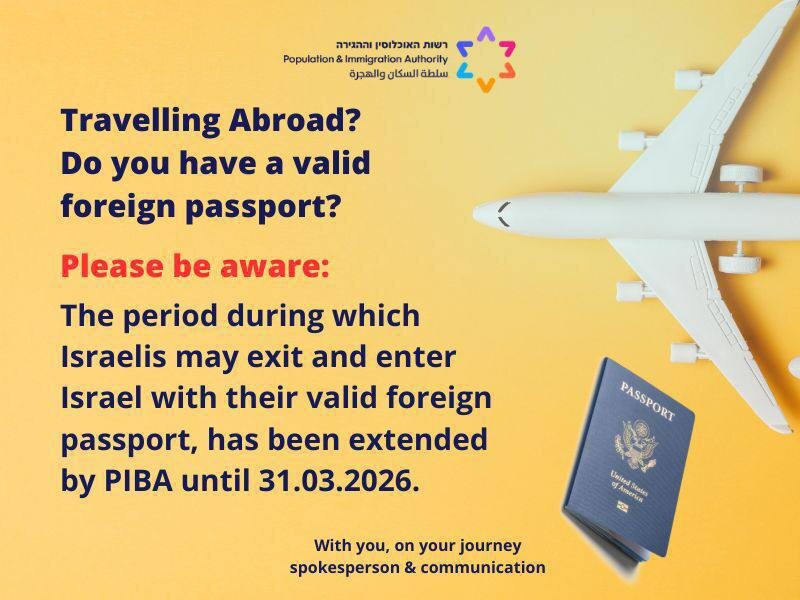 МВД Израиля объявило об очередном продлении разрешения на выезд из Израиля по заграничному паспорту другой страны. Разрешение продлено до 31 марта 2026 года. Это означает, что граждане Израиля, у которых есть действующий иностранный паспорт, по-прежнему могут выезжать из страны по нему, без обязательного использования израильского заграничного паспорта (теудат маавара). 💡Речь идёт именно о временной мере, которая регулярно продлевается МВД с учётом текущей ситуации. ℹ️NewIsraeli следит за всеми изменениями в правилах въезда и выезда и публикует только официальную информацию. Если у вас есть вопросы по документам, паспортам или поездкам — пишите, разберём ваш кейс.