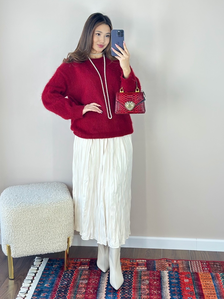 В современном мире моды все больше ценится гармония между стилем и комфортом. Женственность – это не только изящные силуэты и нежные ткани, но и уверенность в себе, которая рождается из ощущения уюта и гармонии с собой. Сегодня собралa для вас 10 актуальных образов, которые идеально сочетают в себе эти два важных аспекта, подчеркивая природную красоту и очарование. Очень роскошно смотрится комби с мохеровым джемпером бордового цвета и белоснежной плиссированной юбки. Бордовый цвет добавляет глубины и благородства, а белоснежная юбка создает струящийся силуэт. Мини-сумочка и длинные жемчужные бусы завершают образ, добавляя ему утонченности и нотку винтажного шика. Белая юбка плиссе в сочетании с темно-синим лонгсливом с открытыми плечами – нежное и женственное сочетание. Открытые плечи добавляют образу пикантности, а темно-синий цвет придает глубину. Белые сапоги продолжают тему легкости и современности. Синяя сумка на цепочке – элегантный акцент, который гармонирует с цветом лонгслива