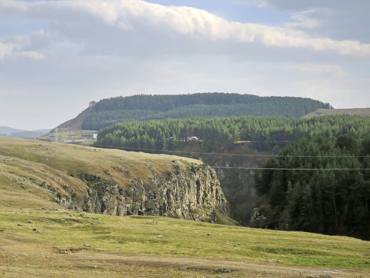 Каньон Дашбаши не так давно превратился в новую модную достопримечательность Цалки, далёкого и холодного уголка Грузии за сотню километров от Тбилиси. Вот так он выглядит на подходе: Дашбаши, 200-метровый каньон Храми, обустроенный некой фирмой из Израиля в 2022 году, год спустя был на пике популярности. Я бы даже сказал, на тот момент он являл собой самую модную и обсуждаемую достопримечательность Грузии, и уж точно, что именно ради него в Цалку едут теперь 99% туристов. Я готовился заплатить за вход 20, ну 30 лар, однако касса огорошила ценников в 49 лари - это 1800 рублей по тогдашнему курсу. За двоих - более 3500, и мы сошлись на том, что оно того не стоит. Кассу стережёт пара гоплитов: А за ней - Бриллиантовый мост длиной 240 метров: Главная "фишка" которого - что-то вроде кафе (кажется, закрытого) в огромном висящем Бриллианте. Позиционируется, что мост стеклянный, но в ультразум видны лишь прозрачные вставки. И я бы сказал, это правильно - чисто стеклянный мост я бы даже с допл