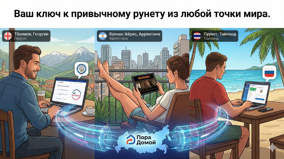 Уехать из России — не значит оборвать связи. Нам всё еще нужно платить налоги, проверять Госуслуги, оплачивать ЖКХ за оставленные квартиры и, конечно, хочется смотреть любимые фильмы на родном языке. Но за границей привычные сайты часто встречают нас белым экраном или ошибкой доступа. Мы спросили наших подписчиков в разных уголках мира, как они решают эту проблему с помощью сервиса «Пора Домой». 🇬🇪 Алексей, Тбилиси: «Спокойно закрыл вопросы с налоговой»