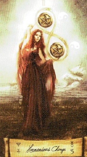 - С Десяткой Пентаклей: Прямая противоположность. Десятка — это груз, окостеневшая материя, бремя собственности. Двойка — это лёгкое, подвижное управление ресурсами, не обременённое излишним грузом.