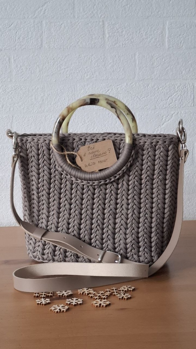 ! Делюсь с вами последним заказом в этом году - новой моделью сумки. Подобную я увидела у бразильской мастерицы, и, конечно же, создала свой вариант. Это был очень захватывающий процесс, начиная от подбора материалов, цвета, и заканчивая последними штрихами! Особенности сумки: – Полиэфирный шнур 5 мм цвета Мокко – Фурнитура из натуральной кожи цвета Капучино ‐ Акриловые ручки бежевого цвета с невероятными кофейными вкраплениями – Узор ёлочка / Рыбий хвост, который потрясающе держит форму – Подкладка с кнопкой (по желанию заказчицы без карманов) – Оптимальный и вместительный размер 32×24 см Результат получился тот, который мы и хотели - сумка в деловом стиле, при этом действительно нежная🤎 В Бразилии у ее "сестры" имя Clarissa) Мне тоже нравится этот вариант. А вам? Оставить это имя или придумаем вместе свое? Напишите в комментариях. Доступна для заказа и в других цветах и деталях