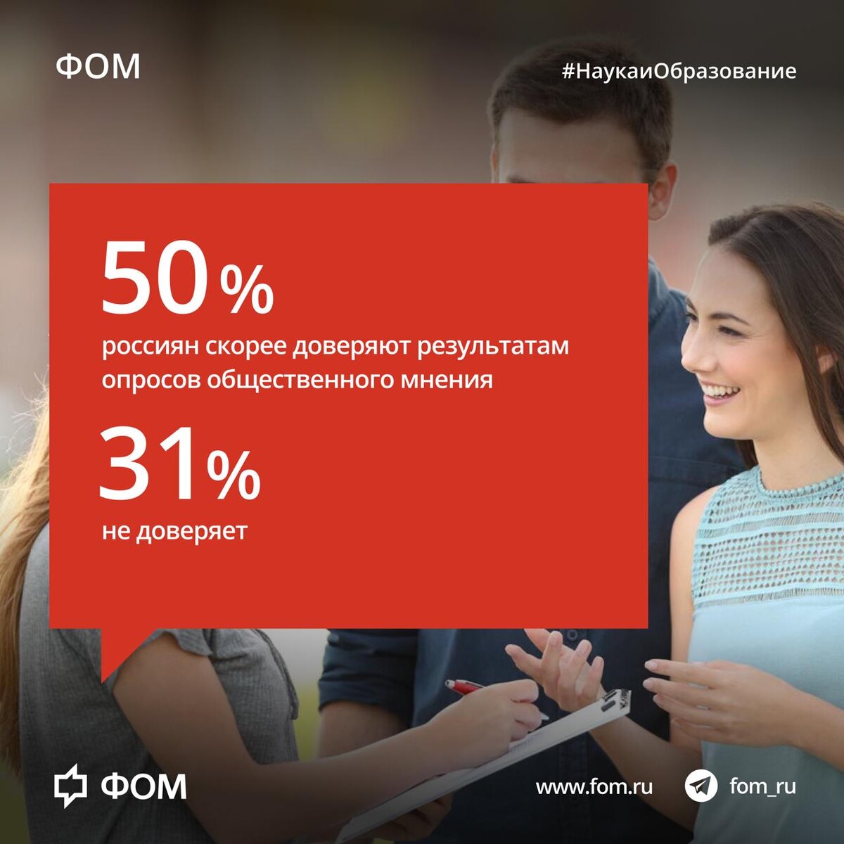ФОМ провел исследование, чтобы узнать, как люди относятся к опросам общественного мнения. Выяснилось, что половина респондентов в целом склонны скорее доверять результатам опросов, среди молодежи этот показатель достигает 61%. Скорее не доверяет опросам 31% граждан, а каждый пятый (19%) затруднился с ответом. Подробнее: fom.ru #опросы #общественноемнение 📱 Фонд Общественное Мнение