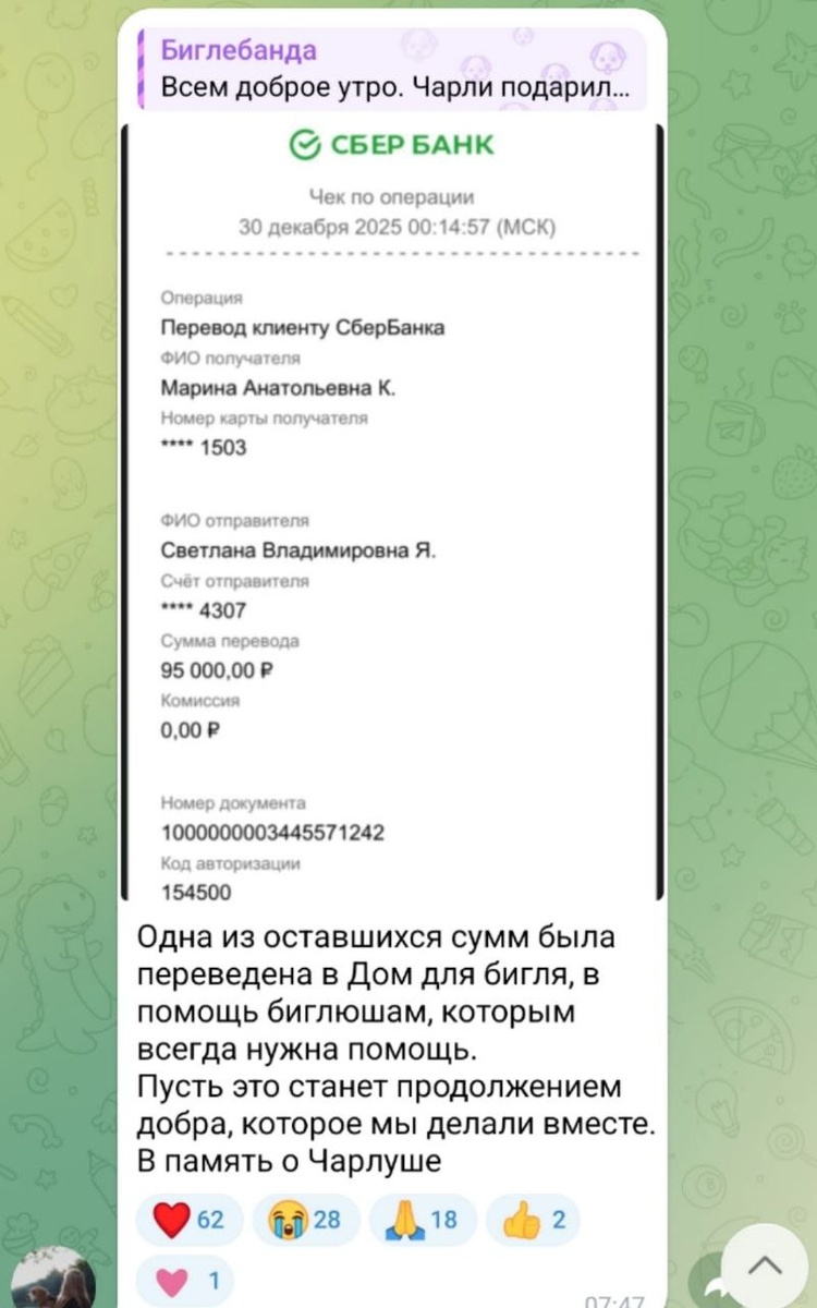 "! В этой группе объединилось много людей с добрыми и открытыми сердцами, которые помогают попавшим в беду биглям и их хозяевам. Так было и с биглюшей Чарли, которой сделали неудачную операцию по извлечению инородного тела из желудка. Потом вторая операция, переливания крови, стационар в клинике, капельницы, куча препаратов. И огромные счета... https://t.me/beagle_help_charly/14 В помощь хозяевам "Биглебанда Москвы" организовала сбор средств для оплаты лечения Чарли, но чуда не произошло. Чарли не стало... 😭🌈 Оставшаяся часть собранных средств на лечение Чарли по их единогласному решению была переведена в фонд "Дома для бигля", за что им огромное-преогромное спасибо от нас и от всех наших подопечных.! Приносим глубочайшие соболезнования хозяевам Чарли.. Они боролись до конца...