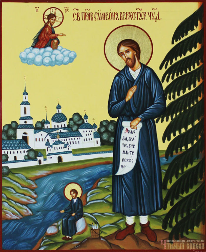 Святой Симеон, по прозванию Верхотурский, жил в первой половине XVII в. Скрывая свое дворянское происхождение, он удалился в деревню Меркушино в окрестностях Верхотурья (в Пермской губернии). Ходил по деревням и бесплатно шил шубы для бедных. Летом на берегах р. Туры молился и ловил рыбу. Симеон любил подавать милостыню, заботился о нуждающихся, наставлял инородцев на путь христианского благочестия. Сподобился дара любви к ближним, достиг совершенного смирения и кротости. Пост и трудная жизнь истощили силы святого, и он скончался преждевременно (как полагают, ему было 25–35 лет) около 1642 г. По распоряжению духовных властей в 1694 г. гроб был открыт, и в нем обнаружили совершенно нетленное тело. Священнику Меркушинской церкви и одному иноку во сне было открыто, что имя новоявленного угодника – Симеон. В 1704 г. мощи праведного Симеона были перенесены в Верхотурье в монастырь во имя святителя Николая Мирликийского. Святой Симеон неоднократно являлся во сне людям, исцелял болящих и пом