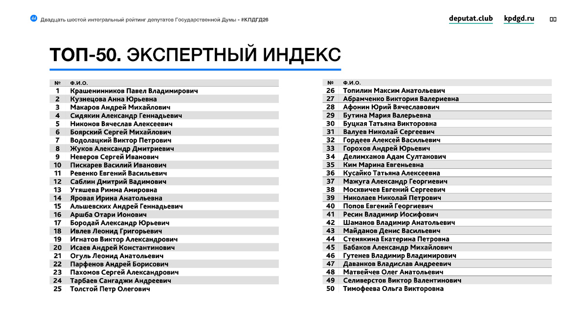 Подсчеты делают по авторской методике. Учитывают активность на заседаниях, медийность, отклики экспертов, народное голосование на сайте… И это большой труд – перевести эффективность парламентариев в конкретные цифры. Спасибо всем причастным! П.С. По итогам нынешнего политического сезона я занял 69 место в общем рейтинге и 15-е в экспертном «Топ-50».