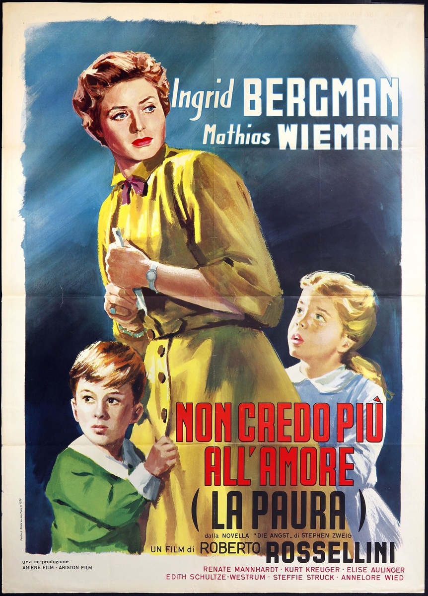 Я очень уважительно отношусь к творчеству Роберто Росселлини. Основоположник неореализма, как-никак. С особым почтением воспринимаю творчество Ингрид Бергман - его жены на тот момент. Ещё с большим трепетом читаю и перечитываю Стефана Цвейга. Фильм этот заявлен, как экранизация его рассказа "Страх". В итальянском варианте на звание фильма более глянцево-мелодраматично: "Я больше не верю в