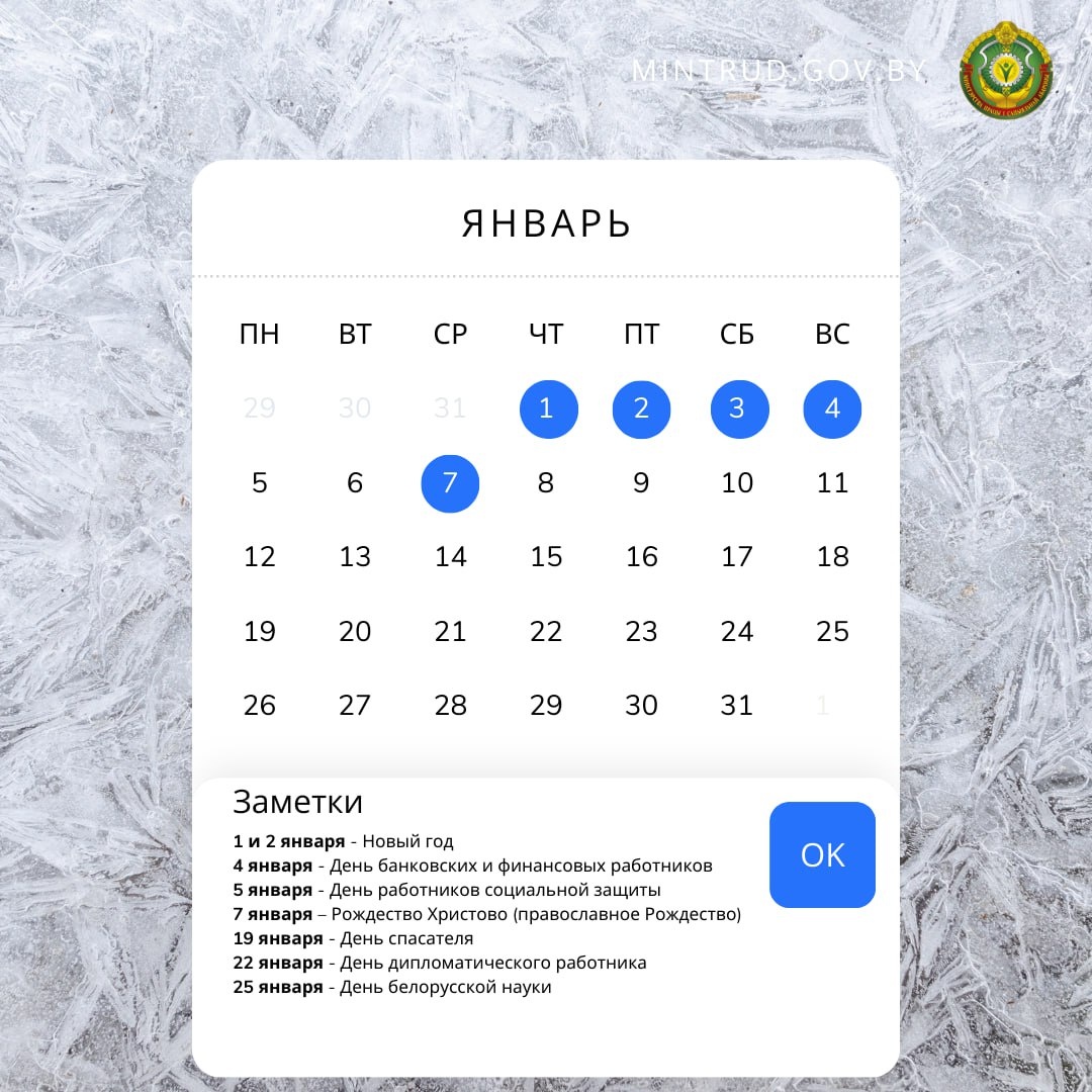 Чтобы всё спланировать и ничего не пропустить. ▪️Всего дней в январе: 31 ▪️Нерабочих дней (праздники + выходные): 12 ▪️Рабочих дней: 19. 📆Новый год для белорусов начнется с больших выходных. Нас ждет сразу 4 дня отдыха – с 1 по 4 января. ✅1 и 2 января (чт, пт) — Новый год. ✅7 января (ср) — Рождество Христово (православное). ➡️Вторник, 6 января, — предпраздничный. 🧮 Расчетная норма рабочего времени в январе при 40-часовой рабочей неделе составит: ▪️для пятидневной рабочей недели с выходными днями в субботу и воскресенье – 151 час; ▪️для шестидневной рабочей недели с выходным днем в воскресенье – 157 часов. 💡 Полезно знать: ✅Неполный рабочий день: если вы работаете, например, на 0,5 ставки, то в предпраздничный день (6 января) ваше рабочее время сокращается не на целый час, а пропорционально — на 30 минут. ✅Если сокращение в предпраздничный день невозможно (например, по условиям непрерывного производства), эта переработка должна быть компенсирована дополнительным отдыхом или повы