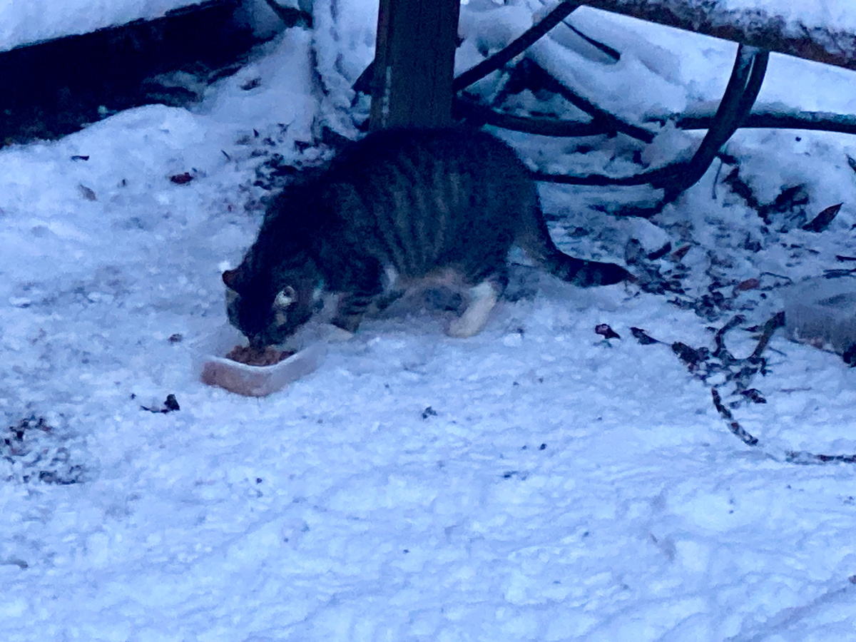 Много снега, сухой корм быстро припорашивает. Котики мои ждут влажный корм, едят с огромным аппетитом, нафоткала их сегодня.