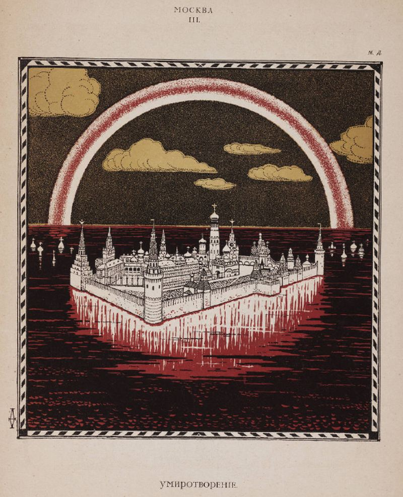 М.Д. (Мстислав Добужинский, 1875—1957). «Москва. Умиротворение». Сатирический журнал «Жупел» №2 за 1905 год. Рисунок изображает, как мы видим, кровавую радугу над Москвой