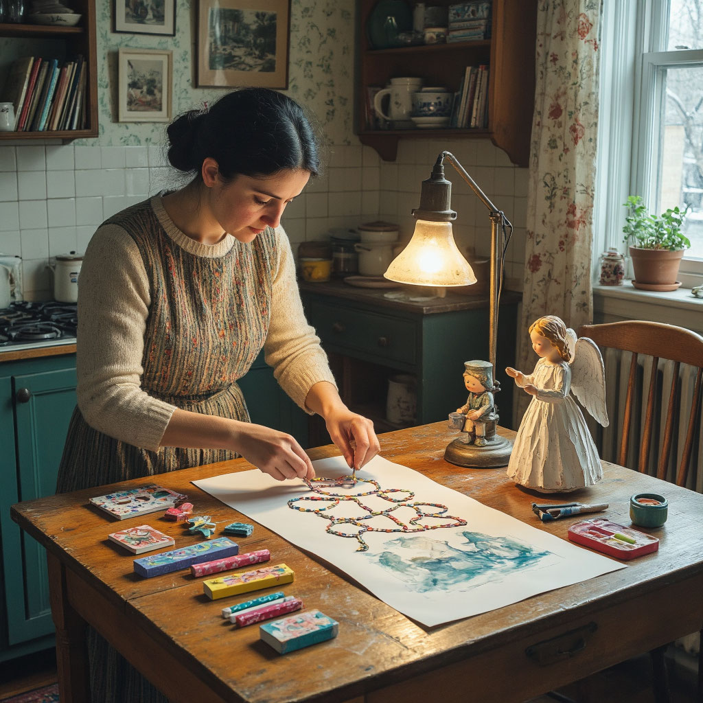 А теперь — небольшая инструкция по созданию ватной игрушки в стиле 1950‑х. Вам понадобятся: хлопковая вата, проволока, крахмальный клейстер (1 ст. л. крахмала на 100 мл воды, проварить до загустения), акварельные краски или гуашь, блёстки, тонкая кисть, нитка для подвешивания. Сначала скрутите из проволоки каркас фигурки — например, зайчика или снеговика. Нанесите на каркас слой ваты, формируя тело, голову, уши. Промажьте заготовку клейстером и оставьте высохнуть (лучше на батарее). После высыхания раскрасьте игрушку, добавьте детали (глаза, нос, узоры на одежде). Для блеска присыпьте блёстками или покройте лаком для волос с эффектом сияния. Привяжите нитку — и ваша ёлочная игрушка готова. Такая поделка не только украсит ёлку, но и перенесёт вас в атмосферу советского Нового года, где каждый элемент праздника создавался с теплом и заботой.