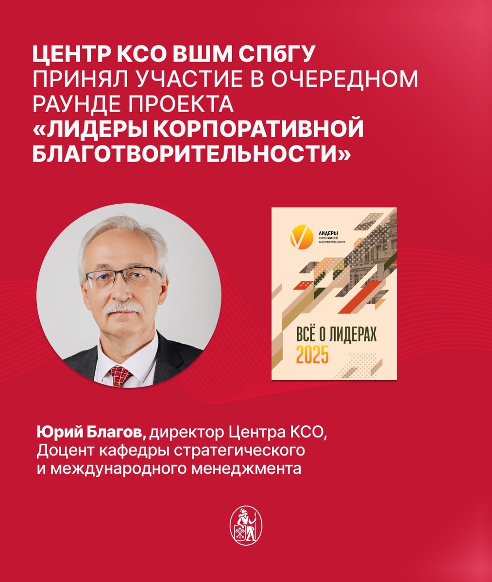 грантодающих организаций «Форум доноров». 📒 Экспертная группа Центра корпоративной социальной ответственности ВШМ СПбГУ (КСО) опубликовала аналитический доклад «Стратегии корпоративной благотворительности: обзор текущего состояния». Авторами выступили директор центра, доцент Юрий Благов и студентка четвёртого курса бакалавриата Дарья Каледжи. Кроме того, Юрий Благов традиционно вошёл в состав экспертного жюри рейтинга компаний, составляемого по результатам проекта. В аналитическом докладе подчеркнуто, что «корпоративная благотворительность сохраняет стратегический характер. Это подтверждается комплексным целеполаганием, которое охватывает создание благоприятной среды для развития компаний на территориях присутствия, повышение эффективности сотрудников, формирование духовно-нравственных ценностей, развитие гражданственности и патриотизма, а также развитие отношений с заинтересованными сторонами… Наметившийся в 2025 г. тренд на интерпретацию Национальных целей развития Российской Феде