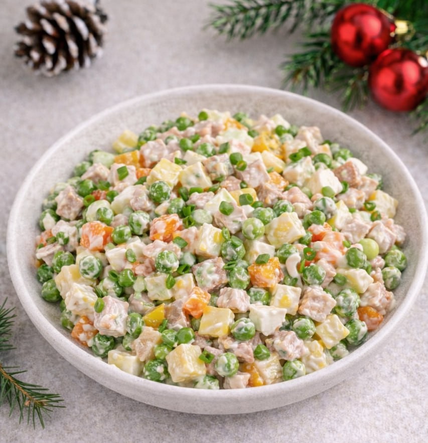 Лёгкий и свежий вариант классического салата с домашним майонезом, больше белка и овощей.
