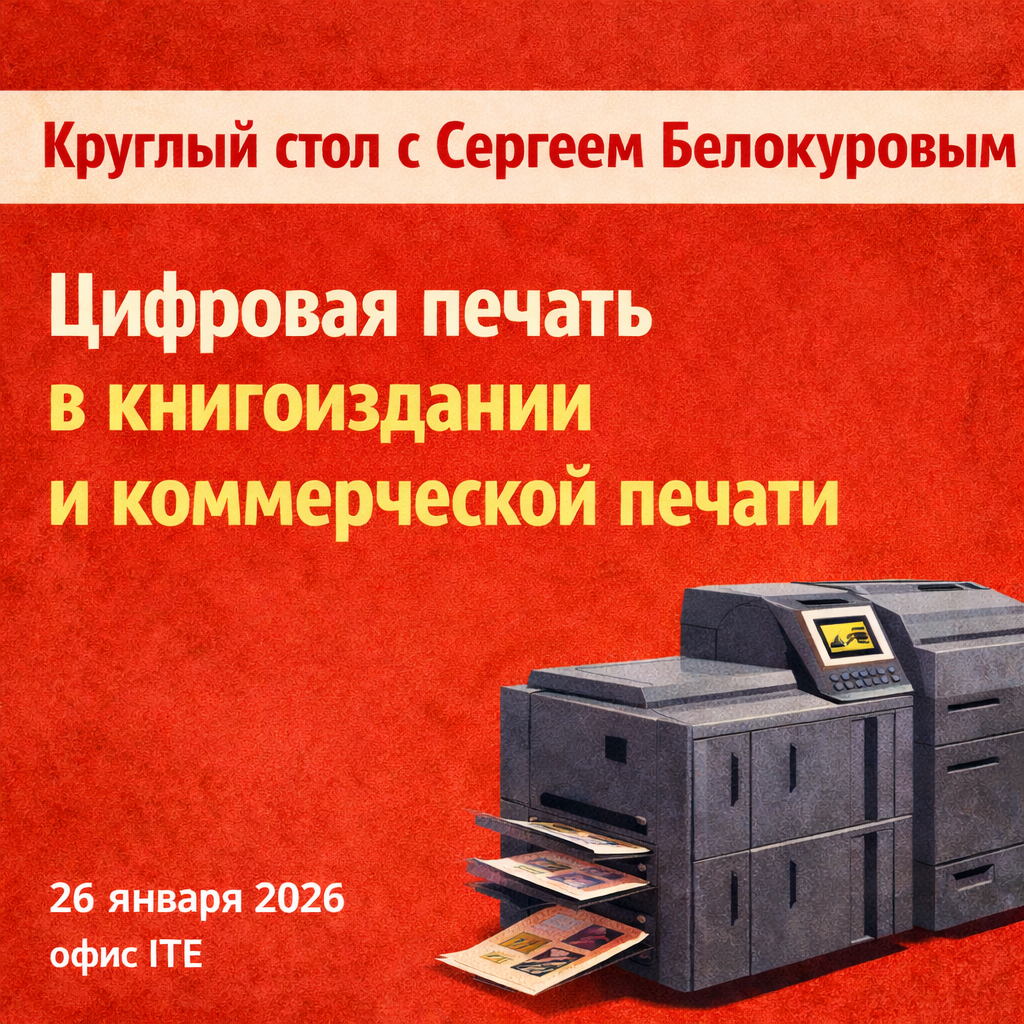 Дарья Князева, маркетолог выставки Printech и RosUpack, уже анонсировала, что в январе у нас будет совместное мероприятие, и нужно уже в последние рабочие часы 2025 года разместить пост с анонсом этого события. 26 января 2026 года пройдёт уже фирменный «Круглый стол с Сергеем Белокуровым» на тему «Цифровая печать в книгоиздании и коммерческой печати». Круглый стол проводится в преддверии выставки Printech, хотя выставка будет в июне, но, я уверен, многие уже друг по другу соскучились, ситуация на рынке (в том числе услуг и оборудования) успела поменяться, и есть огромное количество тем, которые нужно обсудить. Опять же, тема — это только верхушка айсберга, скажем так, направление вектора обсуждения; проблем, вызовов у этой индустрии — огромное количество. Я уже пригласил типографии, поставщиков оборудования, думаю ещё пригласить представителей маркетплейсов как ключевых площадок по реализации книг, которые показывают рост от года к году. Так как без них, я думаю, обсуждение будет неп