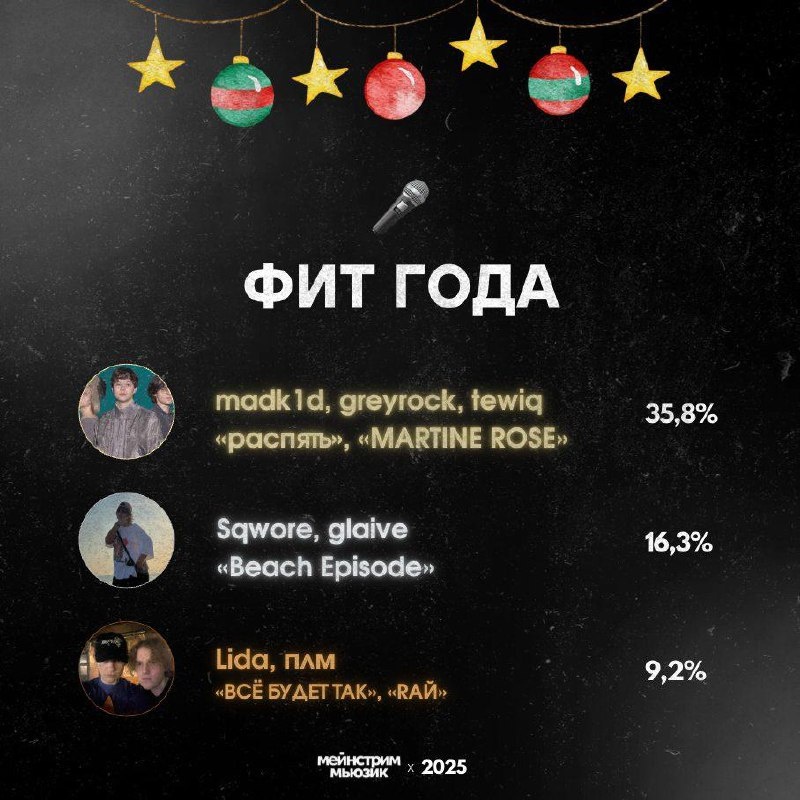 » 🥇– madk1d, greyrock, tewiq – 35,8% 🥈– Sqwore, glaive – 16,3% 🥉– Lida, плм – 9,2% 4 место заняли 5opka и Дмитрий Маликов, Слава КПСС и Пошлая Молли – по 8,2%, а 5 место MARGO, Lil Pump – 7,5%. @mainstreamusic