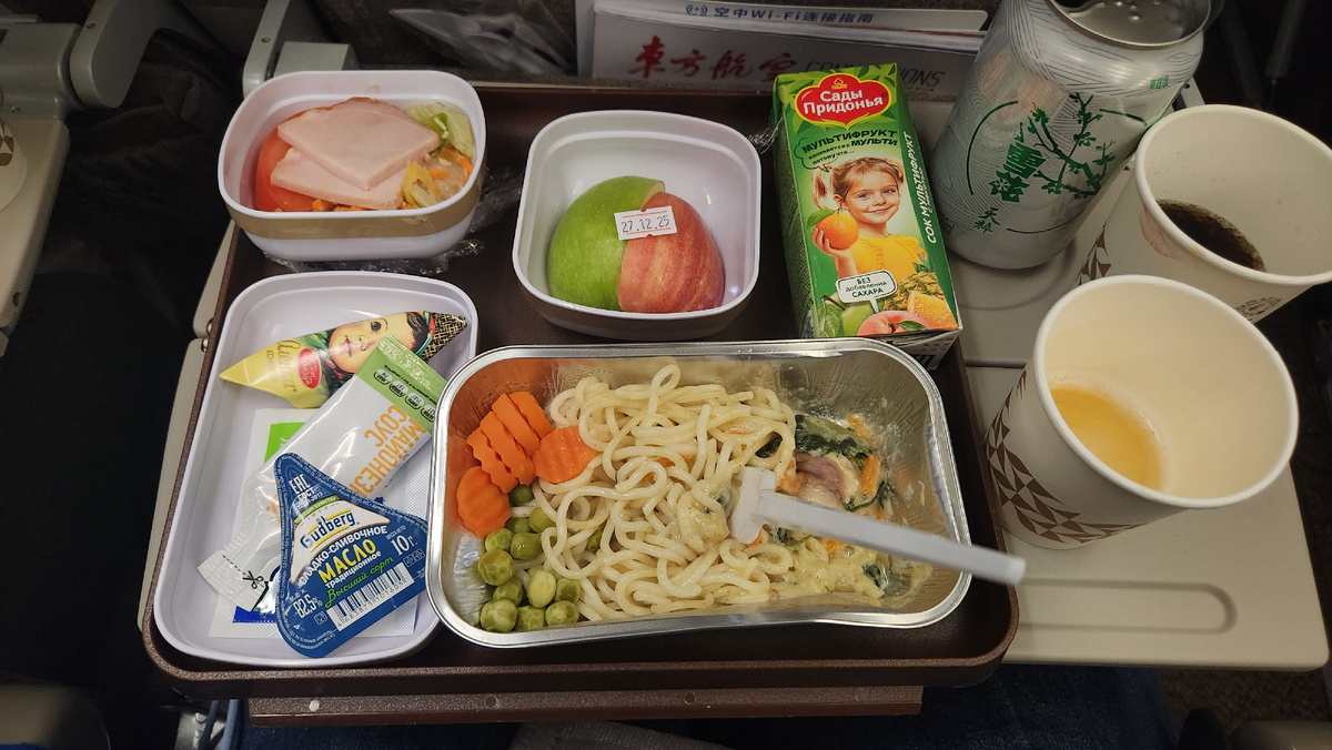 Питание на борту в целом хорошее, без особых изысков. Большая часть продуктов это российские продукты. Голодными вы не останетесь.