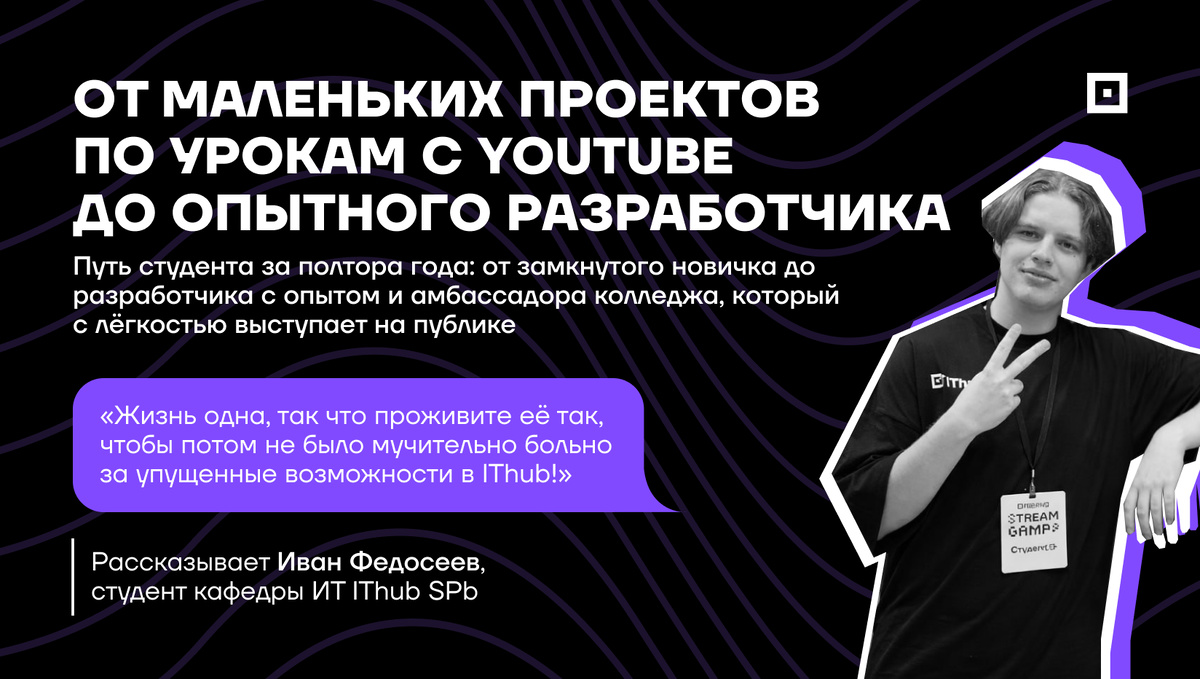 Иван Федосеев пришёл в колледж программирования IThub, уже зная, что хочет быть фронтенд-разработчиком. Но он и представить не мог, насколько стремительным окажется его путь. История Вани о том, как колледж может стать не учёбой, а настоящим трамплином для карьеры, если не бояться брать на себя ответственность. Его путь похож на спринт, затянувшийся на полтора года. В нем будет много движения: хакатоны, стажировки, первые победы и первые заказы. Готовы? Пристегнитесь, будет интересно! Выбор пути и первые шаги Меня зовут Иван, и я учусь на фронтенд-разработчика в IThub. Почему именно этот колледж? Я искал место для развития, а не для заучивания непонятных тем. Когда мы с мамой приехали на встречу с директором Дарьей и увидели площадку, все сомнения исчезли. Я понял, что это моё место, где собраны заряженные на результат люди. С IT я познакомился ещё в 2020 году благодаря дяде-разработчику. Тогда я начал пробовать: смотрел уроки на YouTube и делал маленькие проекты для себя, пока училс