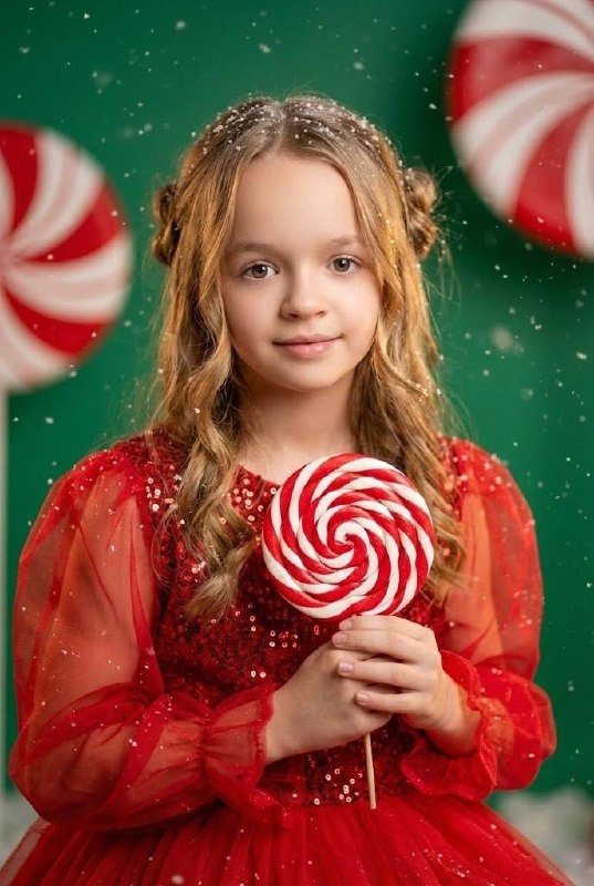 ! Мгновенная автогенерация фото по ссылке тут Или в ручную вводим промт ⚙️ Нейросеть: Banana ⚙️ Промт: Создать фотореалистичное сказочное студийное изображение, точно повторяя сцену, позу, композицию и стиль референса 2. Использовать внешность и лицо ребёнка строго из референса 1, без изменения возраста, пола и черт лица. Сцена: портрет по пояс, ребёнок стоит фронтально, слегка наклонив голову, смотрит прямо в камеру с мягкой, спокойной улыбкой. Причёска: длинные светлые волосы, уложенные волнами, с аккуратными пучками по бокам, в волосах лёгкий эффект снежинок. Одежда: праздничное красное платье с блёстками и полупрозрачными пышными рукавами. В руках — большая круглая карамель на палочке красно-белого цвета, расположена по центру кадра. Фон: ровный студийный фон насыщенного зелёного цвета. На фоне — крупные декоративные элементы в виде красно-белых кругов, напоминающих леденцы, слегка размытые по глубине резкости. Добавить лёгкий эффект падающих снежинок и сказочного мерцания в возд