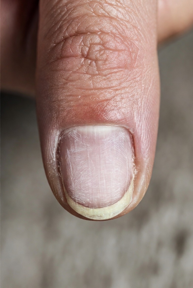 - Потеря блеска и продольные борозды. Здоровый ноготь имеет легкий естественный блеск и относительно гладкую поверхность. При нарушениях функции печени, связанных с жировым гепатозом, ногтевая пластина часто становится тусклой, матовой и покрывается множественными продольными полосами. Это прямое следствие дефицита строительного материала из-за сбоя в синтезе белка.