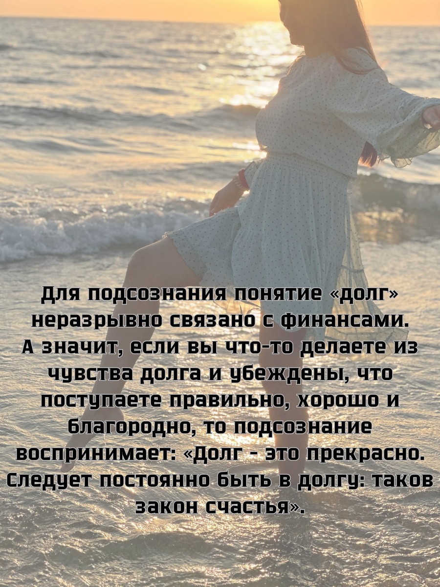 Это как мужчин кодировали от алкоголя, только кодирование на успех, реализацию, деньги и т.д. Каждая фраза подобрана так, чтобы вскрыть и заменить глубинную установку, из которой рождаются долги (в энергетическом смысле). Например: «Я двигаюсь вперёд и не застреваю» (7 число), перепрошивает программу страха неудачи - появляется импульс к действию. Или «Я создаю из любви, не из долга» (3 число) снимает чувство обязанностей и вины - энергия начинает течь свободно. Когда мы произносим фразу, подсознание принимает новую команду.