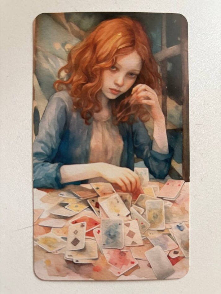 - Девушка здесь в больших раздумьях. Перед ней много карт - будто много соображений. Ей вроде бы интересно поисследовать эти карты, но она постепенно теряет к ним интерес и смотрит дальше... Видимо, как и я тогда... Мне было сначала интересно. Но потом всё стало одним и тем же и будто совсем не моим. Мне хотелось смотреть дальше и увидеть что-то другое. Но было много раздумий. Будто я боялась прогадать, ошибиться...