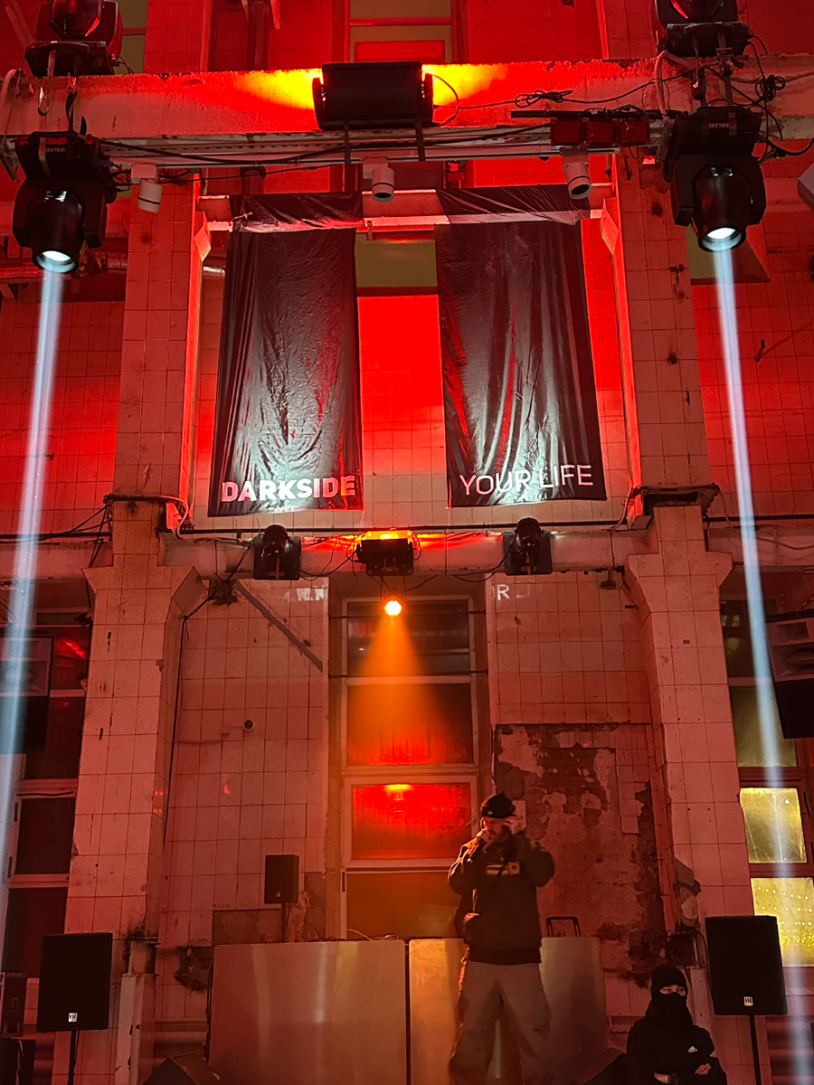 Inside, the venue was still warming up. The first sets rolled in steadily — broken rhythms filling the space, but it felt like everyone, including the building itself, was still slowly switching on. Sometime about an hour later the sound suddenly cut out. Total silence for about thirty minutes — only shadows, conversations, and the low murmur of waiting. Oddly enough, that moment had its own atmosphere: people just stood or sat on the floor, phones glowing, still in the dark while bass continued faintly from somewhere backstage. When everything