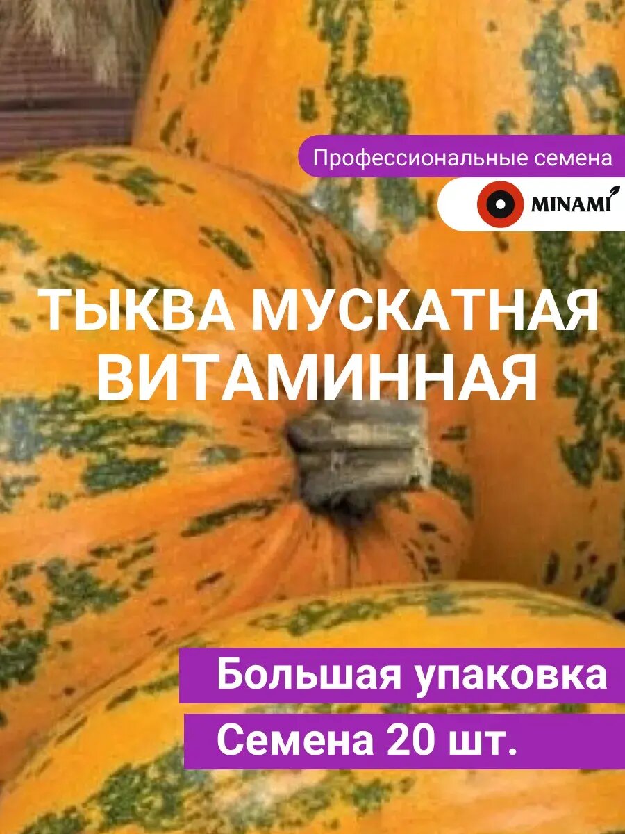 Тыква мускатная Витаминная семена 20шт. Мякоть очень сладкая, ароматная. Высокоурожайный позднеспелый сорт. Период от всходов до полного созревания плодов 125-130 дней. Растение длинноплетистое, средней мощности. Плоды короткоовальные и короткоцилиндрические, широкие, сегментированные, с ребристостью к плодоножке. При полном созревании окраска буро-коричневая с розовым оттенком. Рисунок – темно-зеленая сетка, крупные, мелкие, округлые пятна. Кора тонкая, кожистая. Мякоть ярко-оранжевая, почти красная, хрустящая, сладкая, толщиной 5-10 см. Масса плода 6-7 кг. Сорт столового назначения.