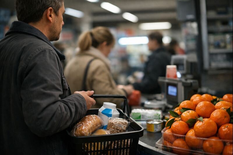 Он стоял, держа в руке корзину — хлеб, молоко, кошачий корм, пачка гречки «на всякий случай». Всё нужное, всё привычное. Жизнь, разложенная по полкам, с ценниками и сроками хранения.